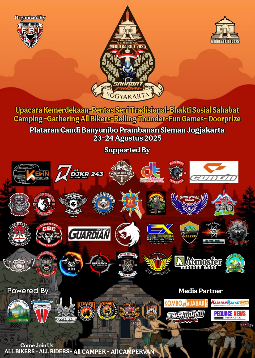 Jogjakarta, 23–24 Agustus 2025 – Dalam semangat memperingati Hari Kemerdekaan Republik Indonesia ke-80, komunitas motor dari berbagai daerah akan berkumpul di event akbar bertajuk Merdeka Ride 2025 – Jogjakarta. Acara ini akan digelar di lokasi penuh nilai sejarah dan budaya, Candi Banyunibo, yang menjadi saksi kekayaan warisan Nusantara sekaligus simbol persatuan lintas komunitas roda dua.